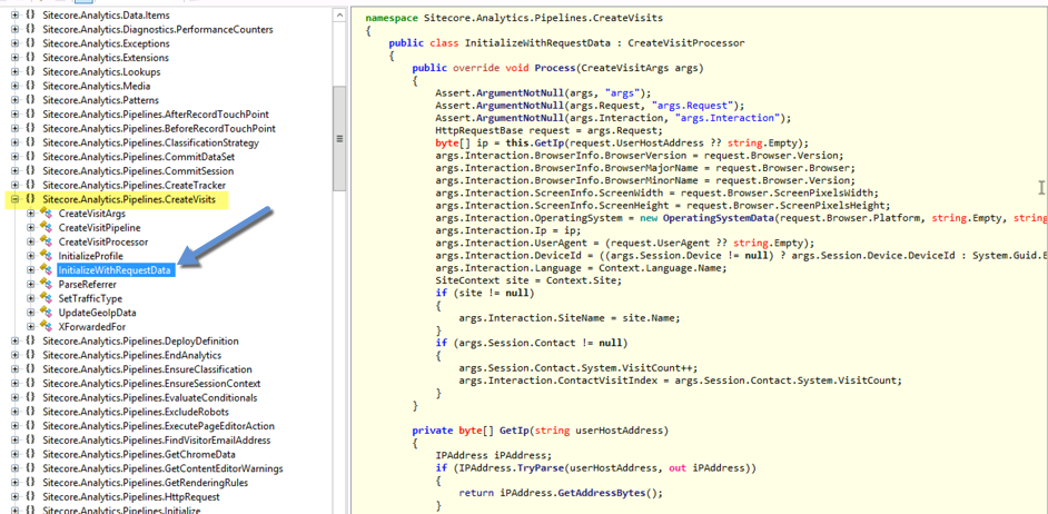 My last thought was to move all the way back to the createVisit pipeline. This is the one that fills the tracker with all the user's information like browser, size, IP, etc... You can see in the image below the class that loads up all the user's info.